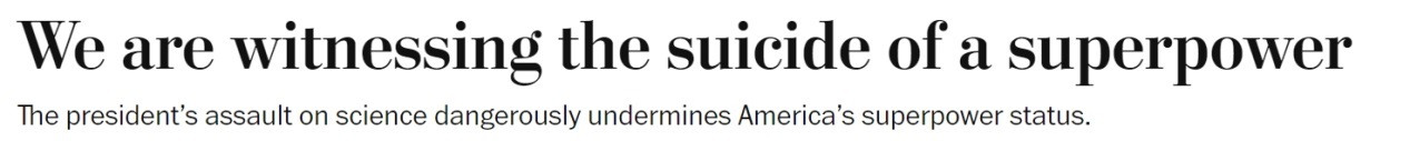 《華盛頓郵報》也刊文警告,美國現(xiàn)政府一直宣稱要讓美國“再次偉大”,但如今它卻正在對美國實力的真正來源——包括對科學(xué)研究的長期投資——造成嚴重的且可能無法彌補的損害。