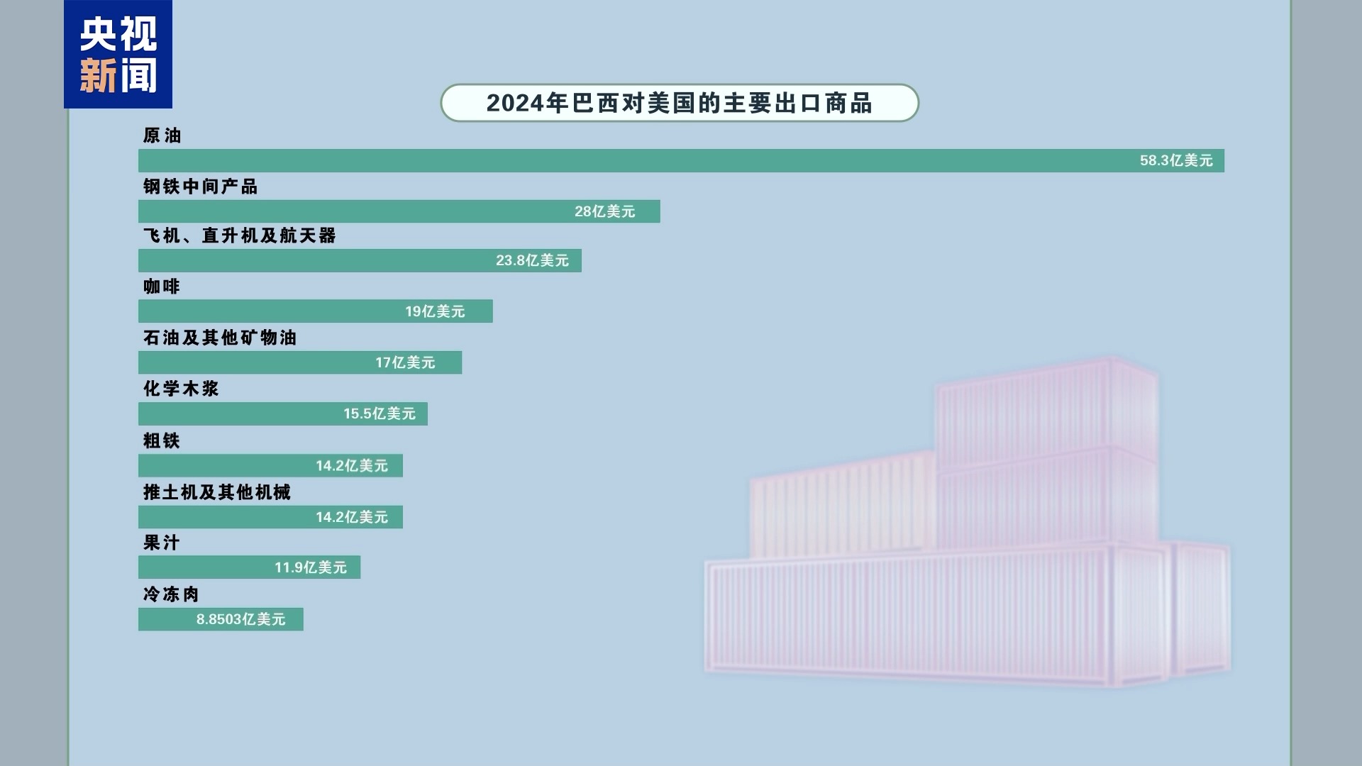 美國(guó)有線電視新聞網(wǎng)報(bào)道稱(chēng),2024年,巴西向美國(guó)出口了總額高達(dá)404億美元的商品。咖啡、果汁、冷凍肉等美國(guó)民眾日常食物以及原油、粗鐵等基礎(chǔ)化工及能源商品都在排名前十內(nèi)。