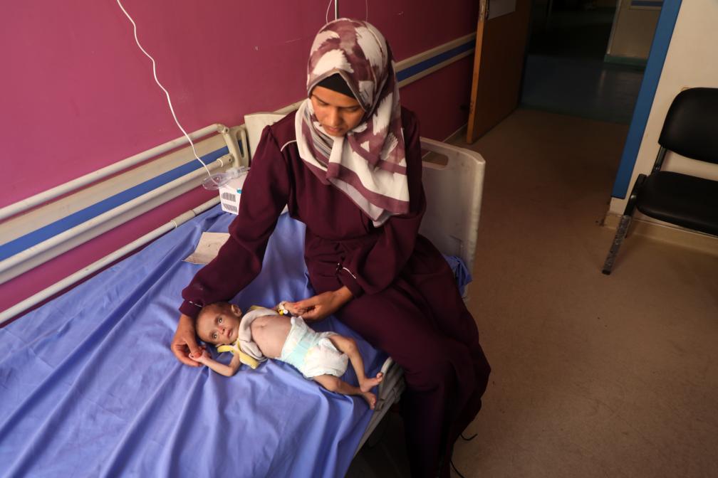 7月23日,在加沙城一所醫(yī)院里,一名女子照顧營(yíng)養(yǎng)不良的兒童。新華社發(fā)(里澤克·阿卜杜勒賈瓦德攝)