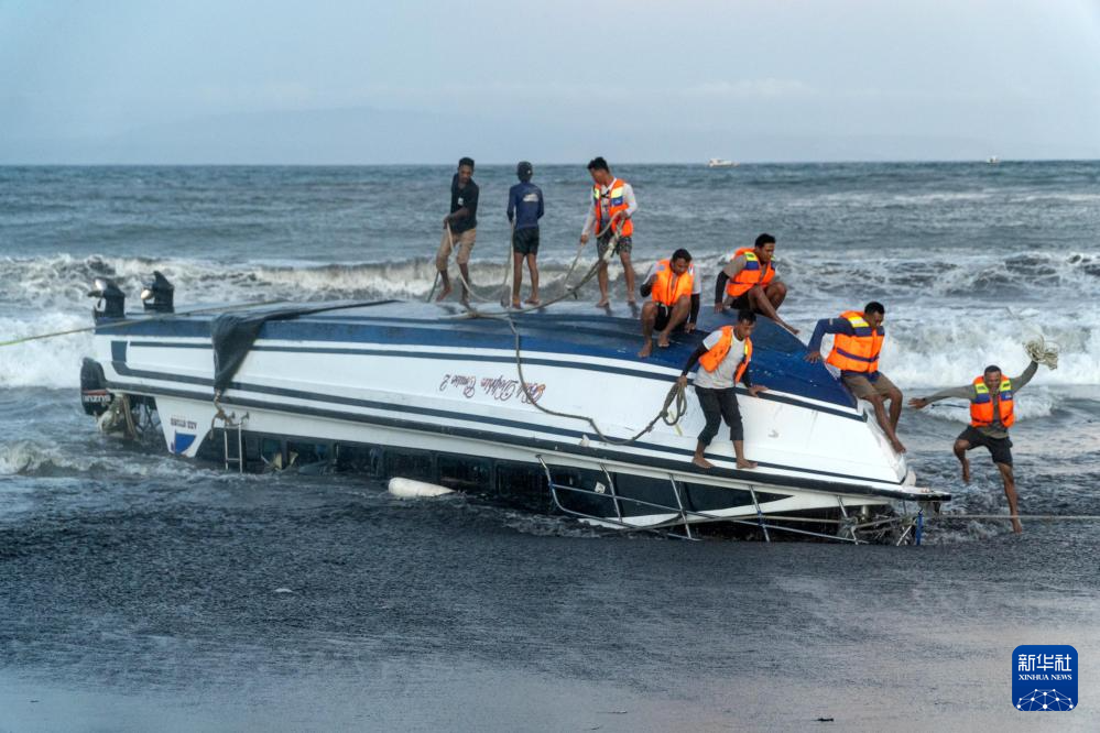 8月5日,在印度尼西亞巴厘島,工作人員將傾覆快艇拉到岸邊。新華社發(fā)(比辛拉西攝)