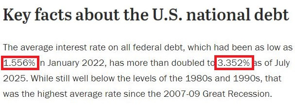 △美國皮尤研究中心的調(diào)查顯示,美聯(lián)邦債務的平均利率在美聯(lián)儲激進加息前的2022年1月曾低至1.556%,而到今年7月已翻了一倍多,達到3.352%,也是自2007-2009年大衰退以來的最高平均利率水平。