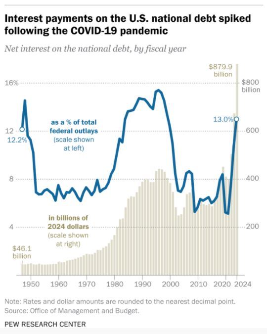 隨著債臺越筑越高,美國政府2024財年支付的凈債息已達到8799億美元,占當年財政總支出的13%,不僅創(chuàng)下25年來的最高比例,而且超過了醫(yī)保支出(8741億美元)和軍費支出(8735億美元)。
