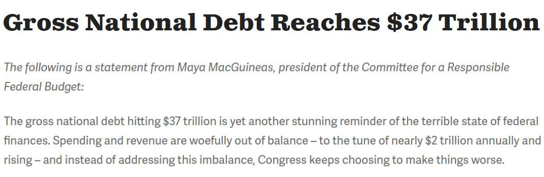 “(美國)國家債務總額達到37萬億美元的現(xiàn)實再次令人震驚地凸顯出聯(lián)邦財政的糟糕狀況。支出和收入嚴重失衡每年造成近2萬億美元的財政赤字,然而美國國會不僅沒有解決這種財政失衡,反而一直選擇讓事情變得更糟。”