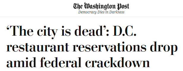 美國首都被“軍管”的這幾天,犯罪率有沒有打下來,民主共和兩黨各說各話;但眾多當(dāng)?shù)夭蛷d公開抱怨,餐飲業(yè)營收因美國政府的“執(zhí)法行動”遭受了重大打擊,“今年8月對華盛頓的餐廳來說格外艱難”。