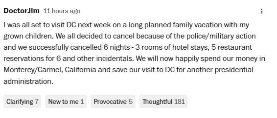 一位網(wǎng)友寫道,他因為軍警管制而取消了去首都的旅程,原本他和家人打算在華盛頓特區(qū)住6晚,在旅館定了3間房,在餐廳提前定了5頓6人餐,但這些消費都被取消了。