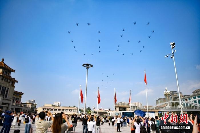 為此次閱兵活動感到激動的不只是阿麗娜?!督袢瞻突固箞蟆穲蟮婪Q,當天,北京居民紛紛走上街頭,一睹壯觀的飛行表演。數(shù)十架直升機匯成“80”字樣,還有直升機分別懸掛“正義必勝”“歷史必勝”“人民必勝”條幅,飛臨天安門廣場上空。