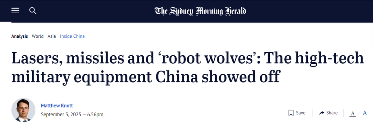 澳大利亞《悉尼先驅(qū)晨報》報道稱,中國閱兵式上展示了彈道導(dǎo)彈、激光武器、戰(zhàn)斗機、水下無人潛航器,甚至還有“機器狼”。