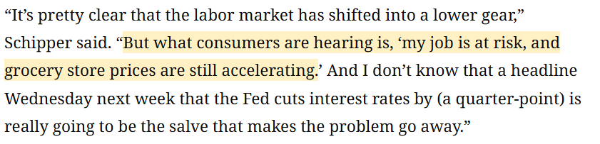 美國圣托馬斯大學(xué)副教授泰勒·施普爾 (Tyler Schipper)認(rèn)為 :對普通消費(fèi)者來說,耳邊最真切的聲音是“我的工作隨時可能保不住”,是“超市里的食品雜貨價格還在一個勁往上漲”。所以我實(shí)在不確定,下周“美聯(lián)儲降息”的頭條新聞,真能成為化解這些現(xiàn)實(shí)困境的良藥嗎?