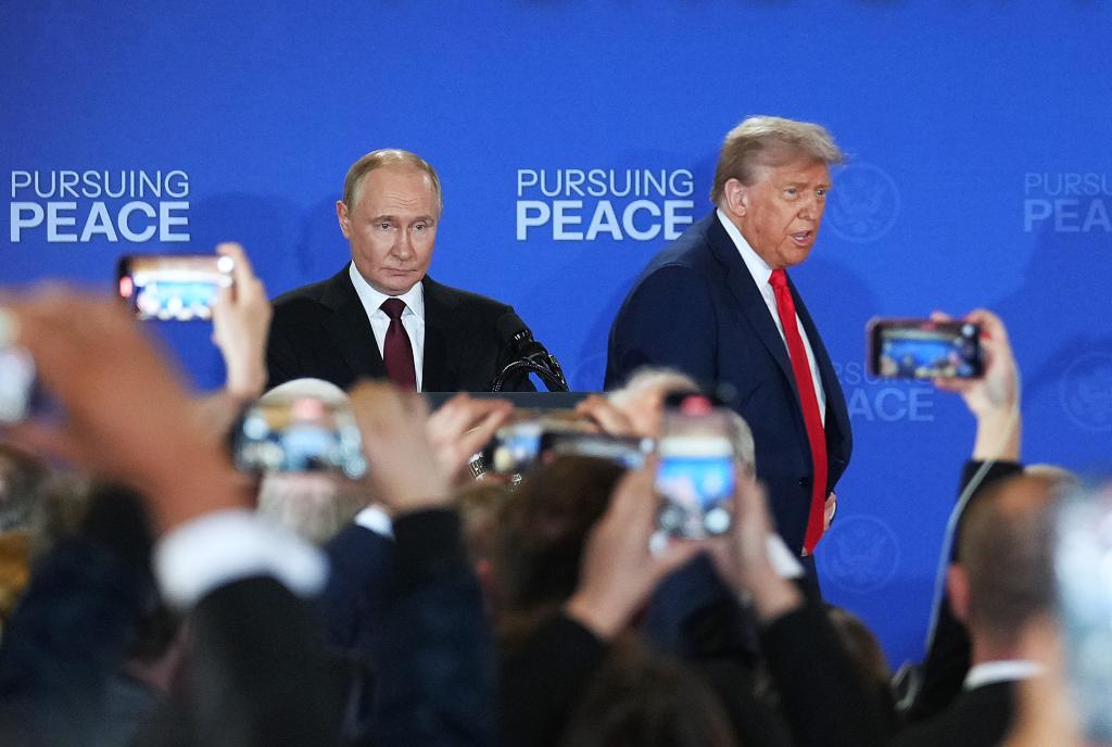 8月15日,美國總統(tǒng)特朗普(后右)與俄羅斯總統(tǒng)普京(后左)在美國阿拉斯加州安克雷奇市埃爾門多夫-理查森聯(lián)合軍事基地舉行會(huì)晤后共同出席聯(lián)合記者會(huì)。新華社記者吳曉凌攝