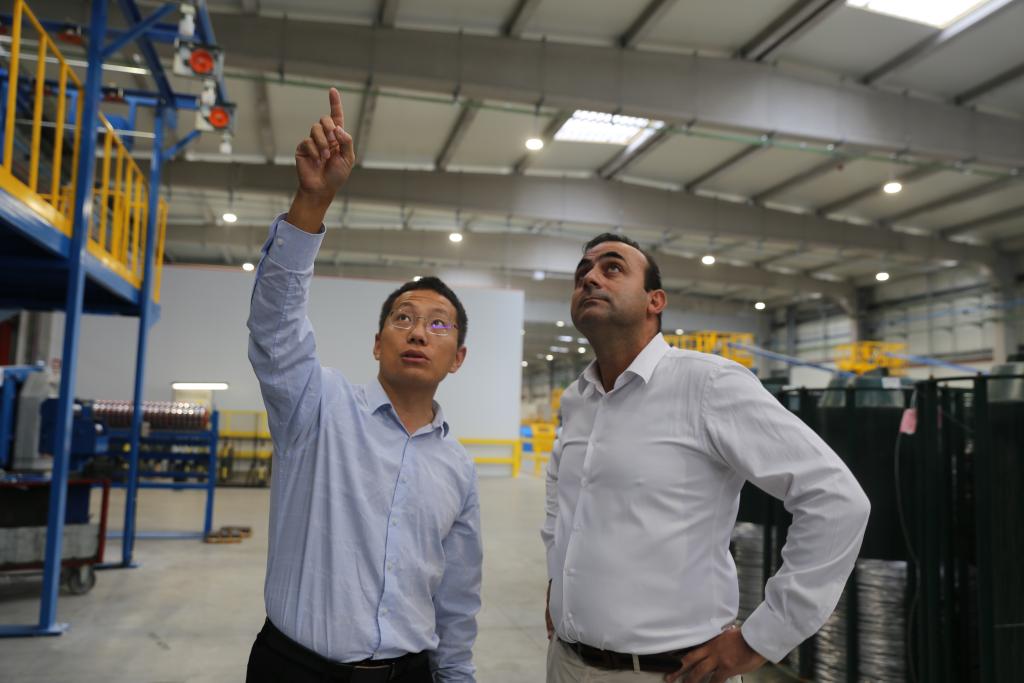 10月3日,在葡萄牙北部奧瓦爾市,亨通集團(tuán)駐葡萄牙的設(shè)備經(jīng)理劉建龍(左)與阿爾科夫雷電纜廠首席運(yùn)營(yíng)官卡洛斯·格蘭雅討論技術(shù)問(wèn)題。新華社記者荀偉攝