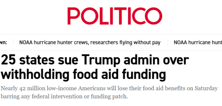 據(jù)美國《政治報》網(wǎng)站報道,受政府持續(xù)“停擺”影響,美農(nóng)業(yè)部宣布暫停其“補(bǔ)充營養(yǎng)援助計劃”(SNAP),11月1日起停止發(fā)放食品救濟(jì)。目前這一項(xiàng)目覆蓋約4200萬人,約占美國總?cè)丝诎朔种?,其中多?shù)為低收入群體和殘障人士。SNAP項(xiàng)目暫停后,他們的生活將難以為繼。當(dāng)?shù)貢r間28日,民主黨主政的25個州和首都華盛頓對聯(lián)邦政府提起訴訟,要求動用聯(lián)邦應(yīng)急資金,以維持這一項(xiàng)目。