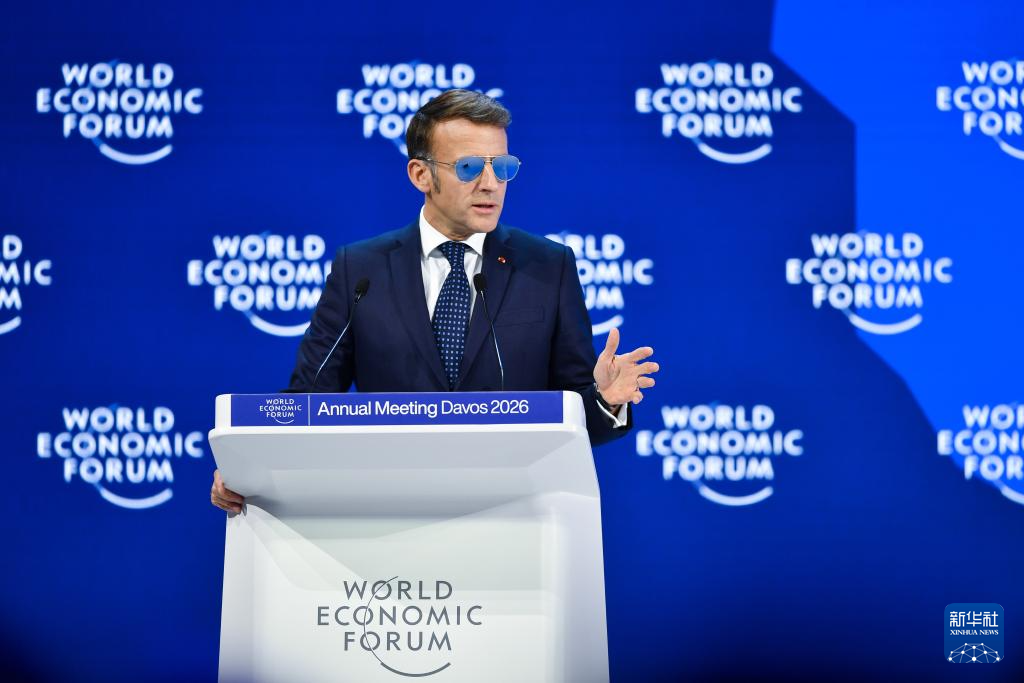 1月20日,法國(guó)總統(tǒng)馬克龍?jiān)谌鹗窟_(dá)沃斯舉辦的世界經(jīng)濟(jì)論壇2026年年會(huì)上講話。新華社記者 連漪 攝