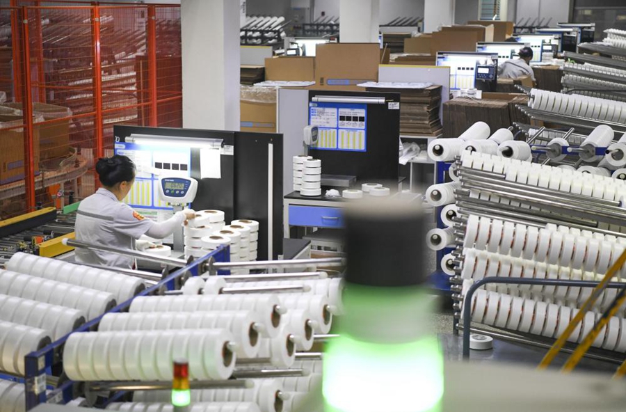 工人在華峰重慶氨綸公司包裝車間作業(yè)(2023年10月16日攝)。新華社記者 王全超 攝