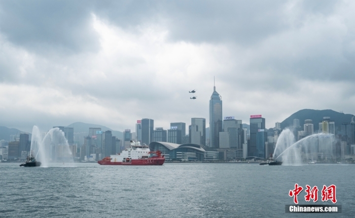4月8日上午,中國首艘自主建造的極地科學考察破冰船“雪龍2”號抵達香港。圖為“雪龍2”號通過維多利亞港時收到海事傳統(tǒng)噴水歡迎。中新社記者 侯宇 攝