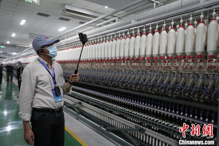 4月13日,外國媒體人來到新疆尉犁縣利華紡織有限公司紡紗廠參觀。 徐雪瑩 攝