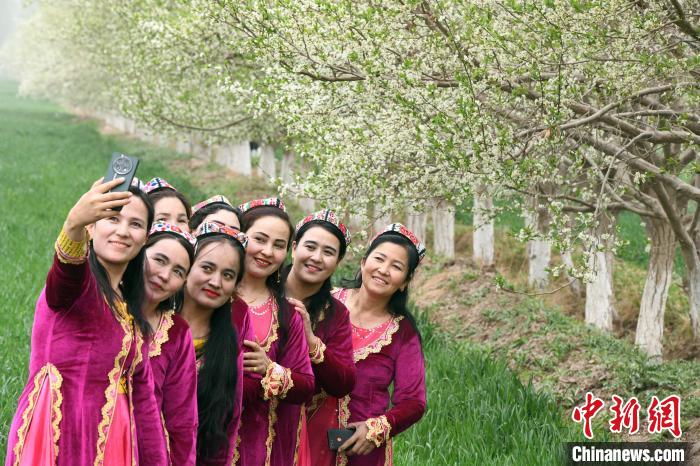 4月15日,新疆伽師縣舉行第四屆新梅花開文學(xué)藝術(shù)采風(fēng)活動(dòng)。圖為新疆伽師縣米夏鄉(xiāng)的民眾在新梅花前自拍。中新網(wǎng)記者孫亭文攝