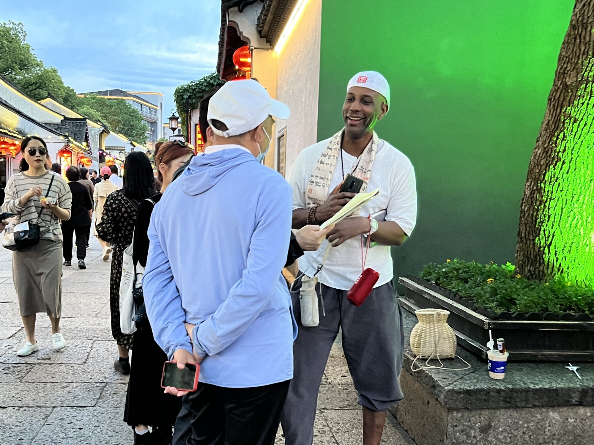 “我叫莊子義,莊周夢(mèng)蝶之莊,子曰詩(shī)云之子,義不屈節(jié)之義?!鼻f子義說,他是美國(guó)人,每年都會(huì)到浙江紹興來,賞古詩(shī)古文,游古鎮(zhèn)古街。在魯迅故里紹興黃酒館門口,他流利地念著門口的對(duì)聯(lián)?!皠⒘娼鑶栒l(shuí)家好,李白還言此處佳?!背酥猓?dāng)場(chǎng)還念起《蘭亭集序》,“群賢畢至,少長(zhǎng)咸集。此地有崇山峻嶺,茂林修竹……我一念起古文就剎不住車。”