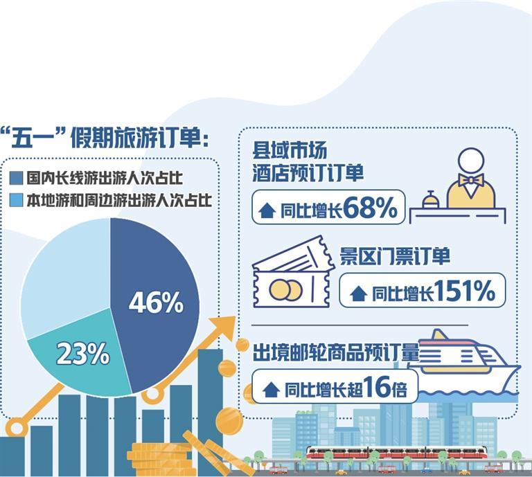 從出游目的地看,北京、上海、重慶、杭州、成都、南京、西安、武漢、廣州等城市是熱門,帶動(dòng)相關(guān)交通和酒店訂單量走高。去哪兒旅行網(wǎng)顯示,北京—上海、成都—西安、上?!錆h、深圳—長(zhǎng)沙、北京—青島等熱門線路的火車票預(yù)約購(gòu)票難度不低于春運(yùn);從上海、北京、深圳、廣州、杭州、南京等地出發(fā),飛往旅游城市的機(jī)票平均支付價(jià)格走高,北京—成都、上海—昆明等熱門航線的部分航班已升至全價(jià);在攜程旅行網(wǎng)上,天水、徐州、淄博、合肥、南昌、迪慶、煙臺(tái)等城市的“五一”假期酒店預(yù)訂增速明顯;四線及以下城市,尤其是縣域旅游市場(chǎng)帶來新增量,縣域市場(chǎng)酒店預(yù)訂訂單同比增長(zhǎng)68%、景區(qū)門票訂單同比增長(zhǎng)151%。