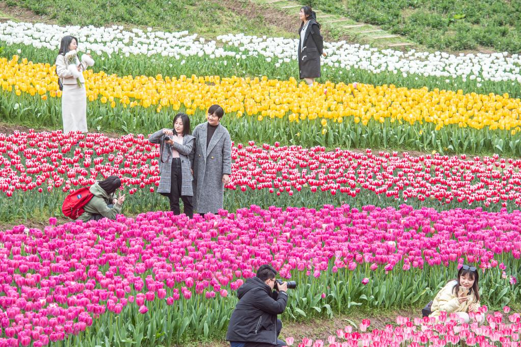 3月9日,在位于重慶市長壽區(qū)的長壽湖景區(qū),游客在郁金香花海中賞花拍照。景區(qū)今年一共從荷蘭進(jìn)口郁金香種球近60萬粒,分三大系列27個(gè)品種,種植面積約12000平米。新華社記者唐奕攝