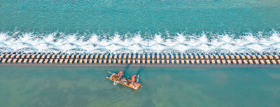 湖南省永州市東安縣白牙市鎮(zhèn)鐵爐村村干部(左)與志愿者在湘江一級支流紫水河上打撈漂浮物。 蔡小平攝(人民視覺)