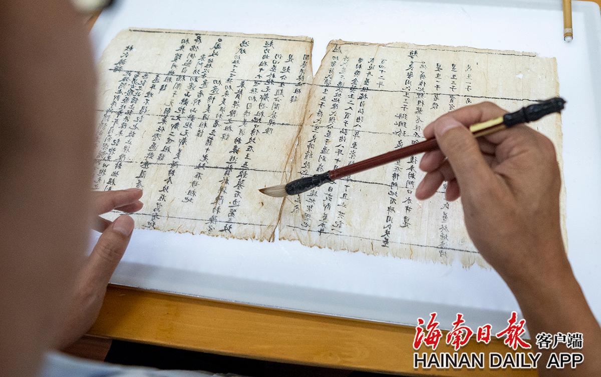 黃文鋒在給古籍補(bǔ)粘紙張 。海南日報(bào)記者袁琛 攝