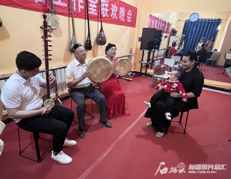 棗然木和女兒、女婿都是哈密木卡姆項目代表性傳承人,她的老伴賽買提·艾力木是納格拉鼓哈密市級代表性傳承人。像這樣一家有好幾位非遺傳承人的家庭,在回城鄉(xiāng)并不是個例。