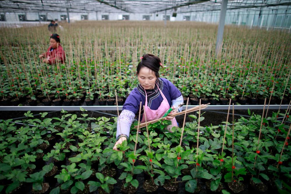 在貴州省榕江縣車江壩區(qū)智慧育苗中心內,一名少數(shù)民族婦女在大棚內對百香果苗進行管理(2023年2月28日攝)。新華社記者 劉續(xù) 攝
