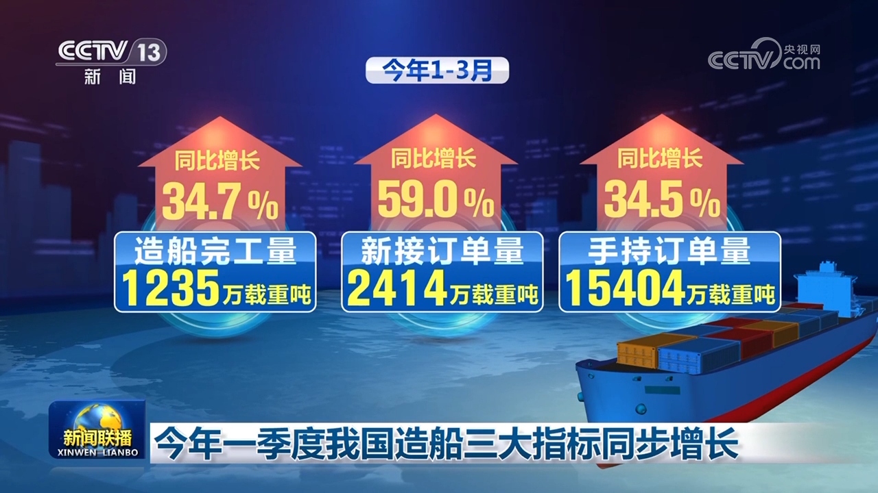今年1—3月,我國造船完工量1235萬載重噸,同比增長34.7%;新接訂單量2414萬載重噸,同比增長59.0%;手持訂單量15404萬載重噸,同比增長34.5%。以載重噸來計(jì)算,三大指標(biāo)分別占到了全球總量的53.8%、69.6%和56.7%。