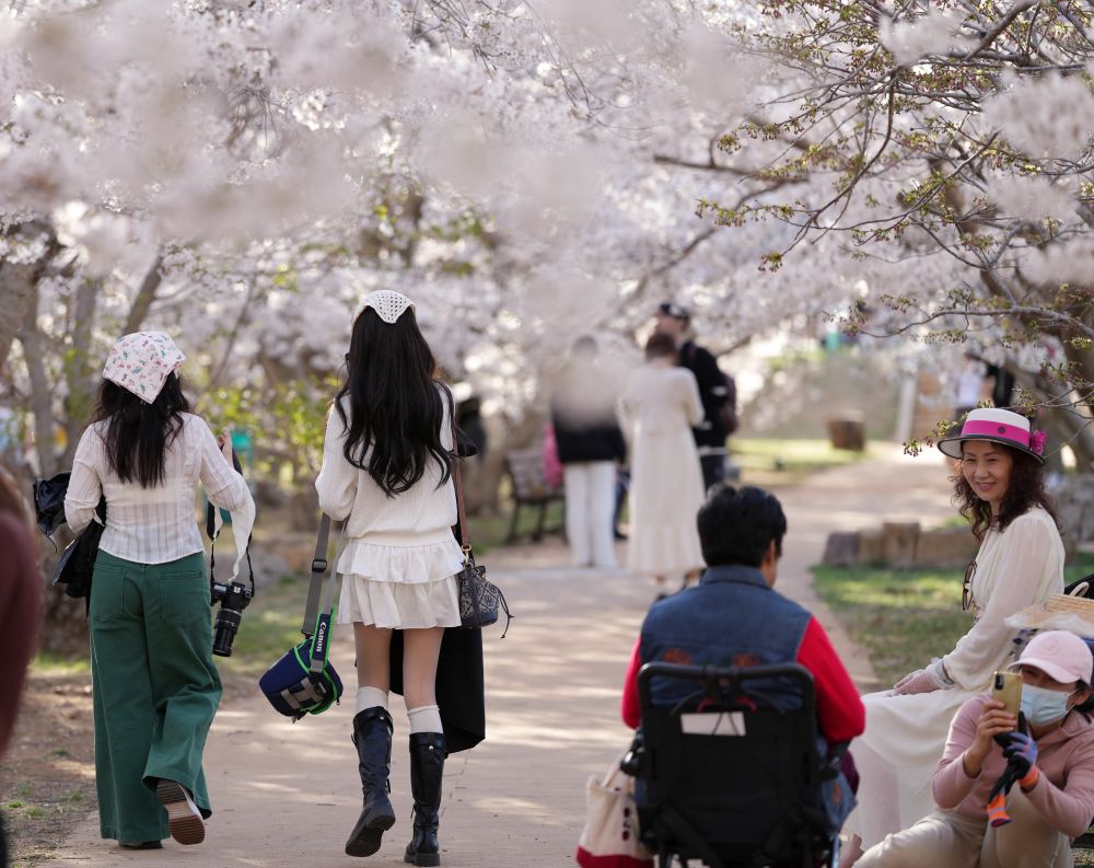 2024年4月17日,游客在遼寧省大連市龍王塘櫻花園內(nèi)賞花、游覽。 新華社記者 李鋼 攝