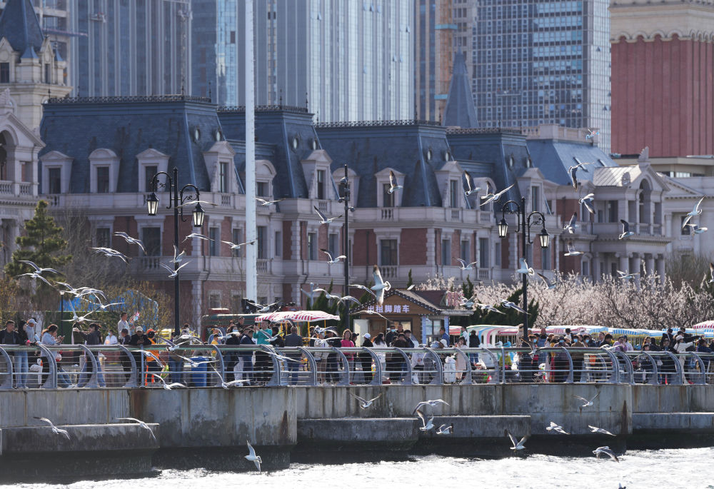 2024年4月16日,在遼寧省大連市東港商務(wù)區(qū),游客在海邊休閑觀光。 新華社記者 李鋼 攝