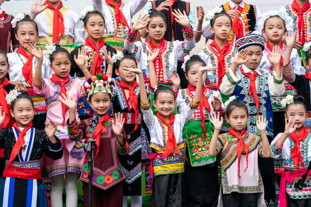 “咿唔瑟,咿唔瑟,吸噶拉羅,哈賽賽,賽哩羅作搓……”(歌詞大意為:巧遇大家來唱歌喲)視頻連線的另一邊,隨著哈尼族兒歌《阿密策》響起,38名身著苗、瑤、傣、哈尼族等民族服飾的同學(xué)們,將歡快的歌聲獻(xiàn)給“奧比昂爺爺”。