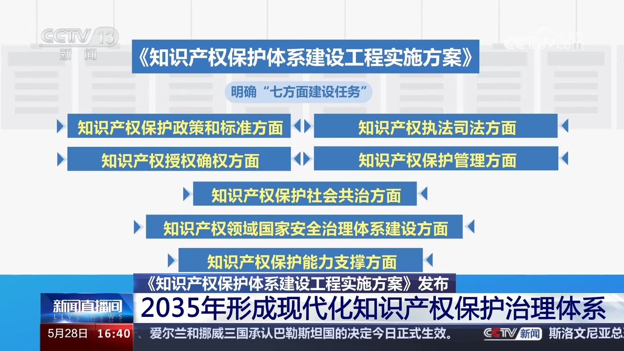 國家知識產(chǎn)權(quán)局5月28日舉行新聞發(fā)布會,重點介紹《知識產(chǎn)權(quán)保護(hù)體系建設(shè)工程實施方案》(以下簡稱《方案》)有關(guān)情況?!斗桨浮访鞔_,到2035年,知識產(chǎn)權(quán)保護(hù)體系和保護(hù)能力現(xiàn)代化基本實現(xiàn),形成政府履職盡責(zé)、執(zhí)法部門嚴(yán)格監(jiān)管、司法機(jī)關(guān)公正司法、經(jīng)營主體規(guī)范管理、行業(yè)組織自律自治、社會公眾誠信守法的現(xiàn)代化知識產(chǎn)權(quán)保護(hù)治理體系。