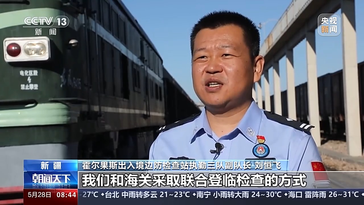霍爾果斯出入境邊防檢查站執(zhí)勤三隊(duì)副隊(duì)長 劉恒飛:我們和海關(guān)采取聯(lián)合登臨檢查的方式對班列車體進(jìn)行檢查,查驗(yàn)出入境司乘人員和貨物基本是同步進(jìn)行,30分鐘內(nèi)即可完成查驗(yàn)。
