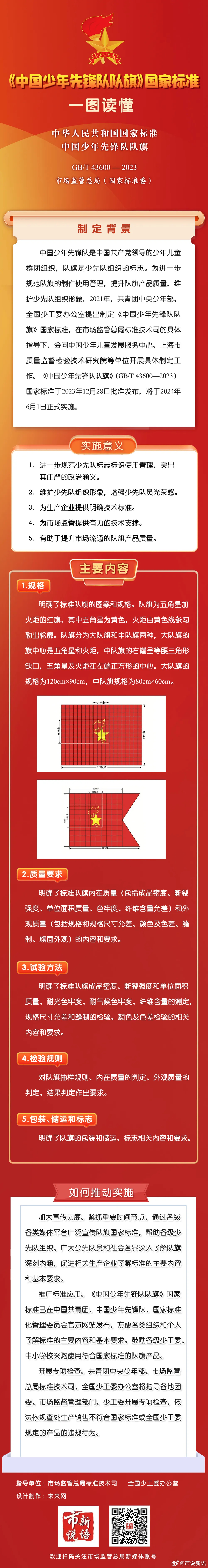 《中國少年先鋒隊隊旗》(GB/T 43600—2023)國家標準將于2024年6月1日正式實施。該標準由市場監(jiān)管總局(國家標準委)批準發(fā)布,共青團中央、全國少工委會同相關單位編制。