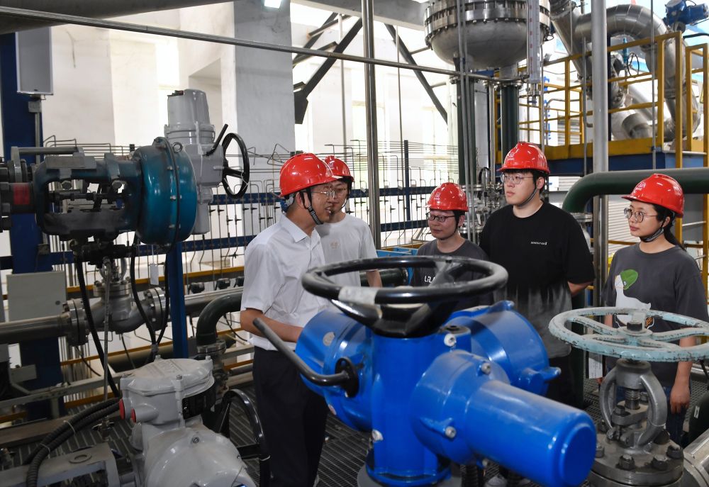 5月24日,在位于成都的中國核動力研究設(shè)計院內(nèi),鐘元章(右一)與團(tuán)隊年輕人在試驗臺架上交流。