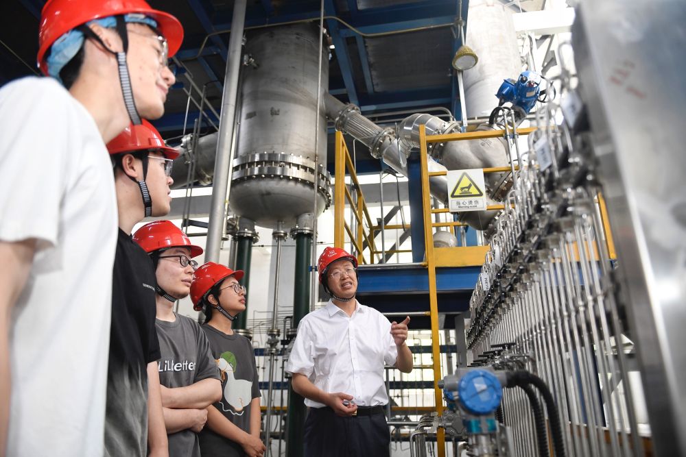 5月24日,在位于成都的中國核動力研究設(shè)計院內(nèi),鐘元章(左一)與團(tuán)隊年輕人在試驗臺架上交流。