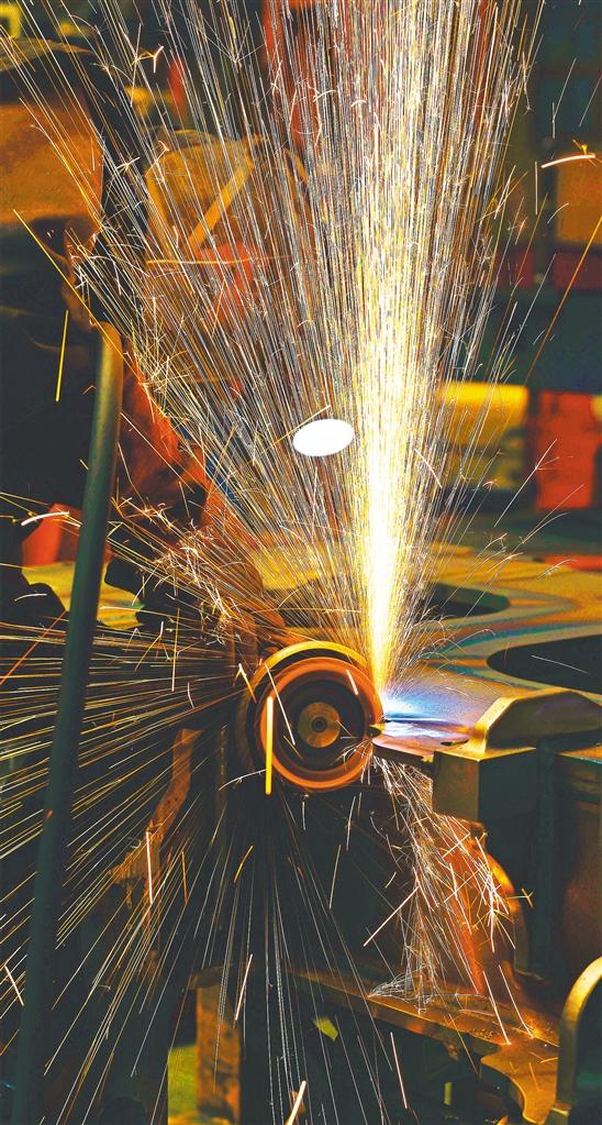 ▼5月28日,中車(chē)長(zhǎng)客轉(zhuǎn)向架事業(yè)部焊接產(chǎn)線組,員工在進(jìn)行動(dòng)車(chē)組構(gòu)架橫梁焊后修磨作業(yè)。