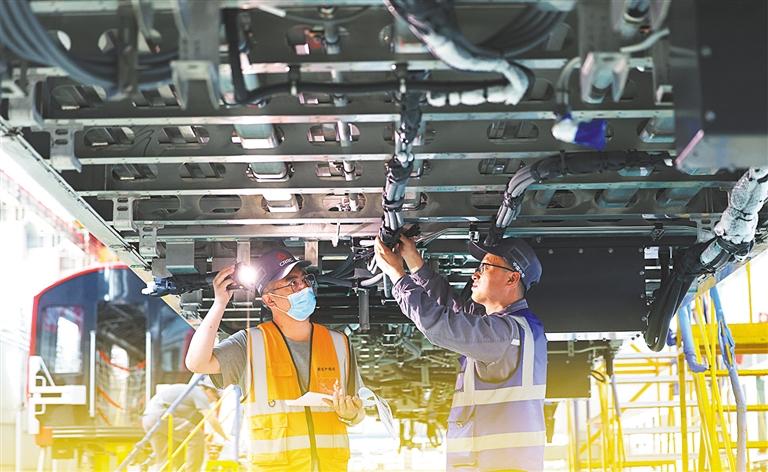 ?5月28日,中車(chē)長(zhǎng)客首席操作師羅昭強(qiáng)(前一)在對(duì)新一批復(fù)興號(hào)智能動(dòng)車(chē)組進(jìn)行出廠前的質(zhì)量檢查。