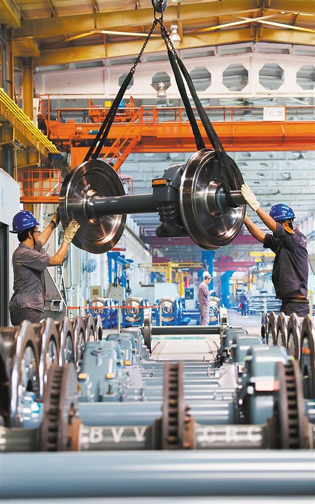 ▼5月28日,中車(chē)長(zhǎng)客轉(zhuǎn)向架事業(yè)部總成產(chǎn)線組,員工在進(jìn)行城軌輪對(duì)壓裝作業(yè)。