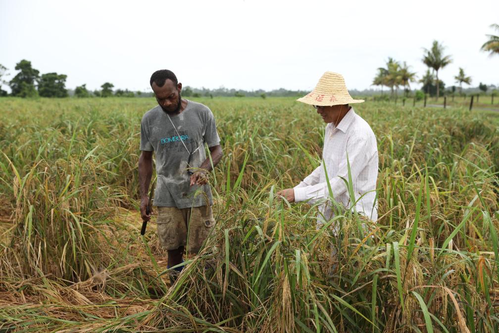 3月13日,在太平洋島國斐濟瑙索里鎮(zhèn),中國專家(右)在中國援斐濟農(nóng)業(yè)發(fā)展技術(shù)水稻項目試驗示范培訓基地查看暴雨過后水稻倒伏情況。新華社發(fā)(桑欽龍攝)