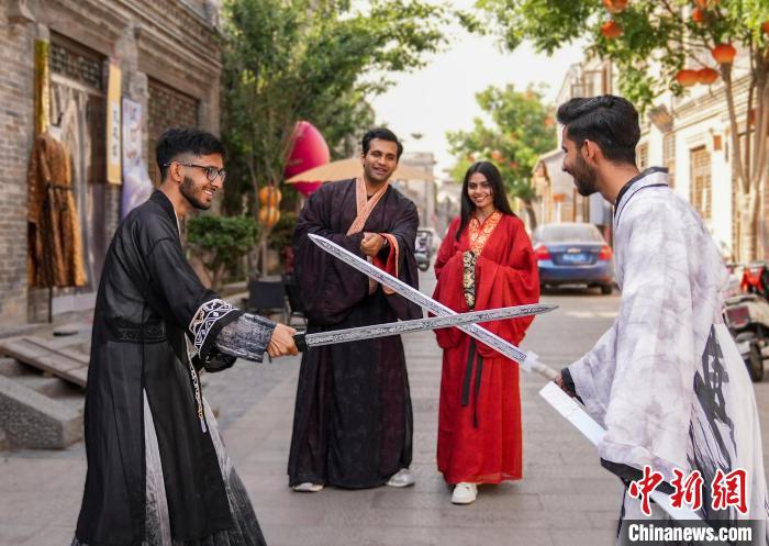 圖為邯森等4名巴基斯坦留學(xué)生在回車巷歷史文化街區(qū)穿漢服,感受中國傳統(tǒng)文化。王倩倩 攝