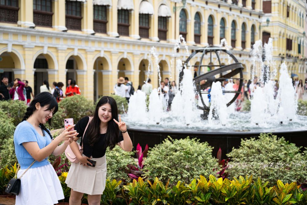 5月1日,游客在澳門議事亭前地游覽、拍照。新華社記者 張金加 攝