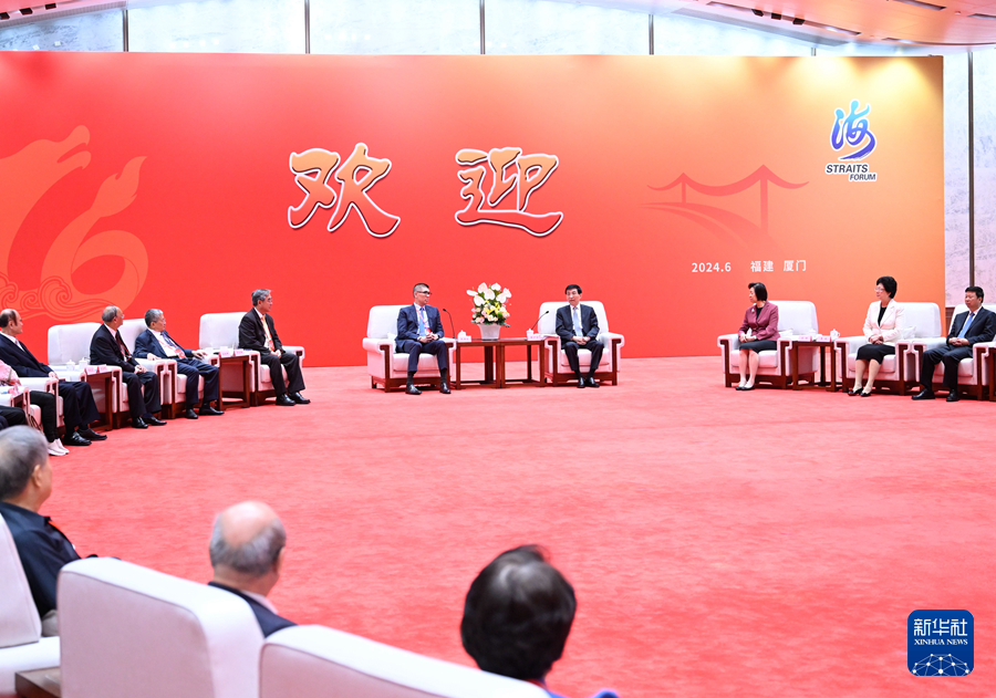 6月15日,第十六屆海峽論壇大會在廈門舉行。中共中央政治局常委、全國政協(xié)主席王滬寧出席并致辭。這是大會開始前,王滬寧會見參加論壇的臺灣嘉賓代表。新華社記者 申宏 攝