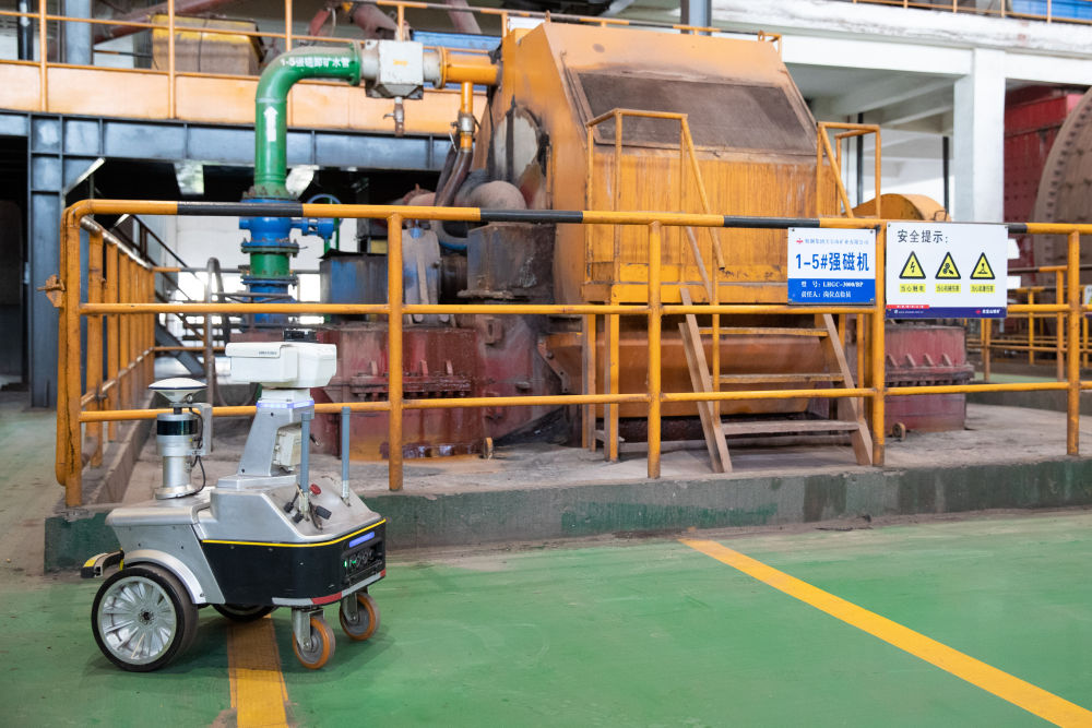 生產(chǎn)現(xiàn)場無人化,依靠什么來實現(xiàn)?步入磨磁車間,巨大的轟鳴聲在這個長約100米、寬約50米、高約30米的廠房內(nèi)回響。登上二樓作業(yè)平臺,兩臺直徑6.2米的大型球磨機上的轉輪正在飛速旋轉。不遠處,磨磁巡檢機器人閃爍著燈光,正在采集設備溫度、振動等狀態(tài)數(shù)據(jù)。