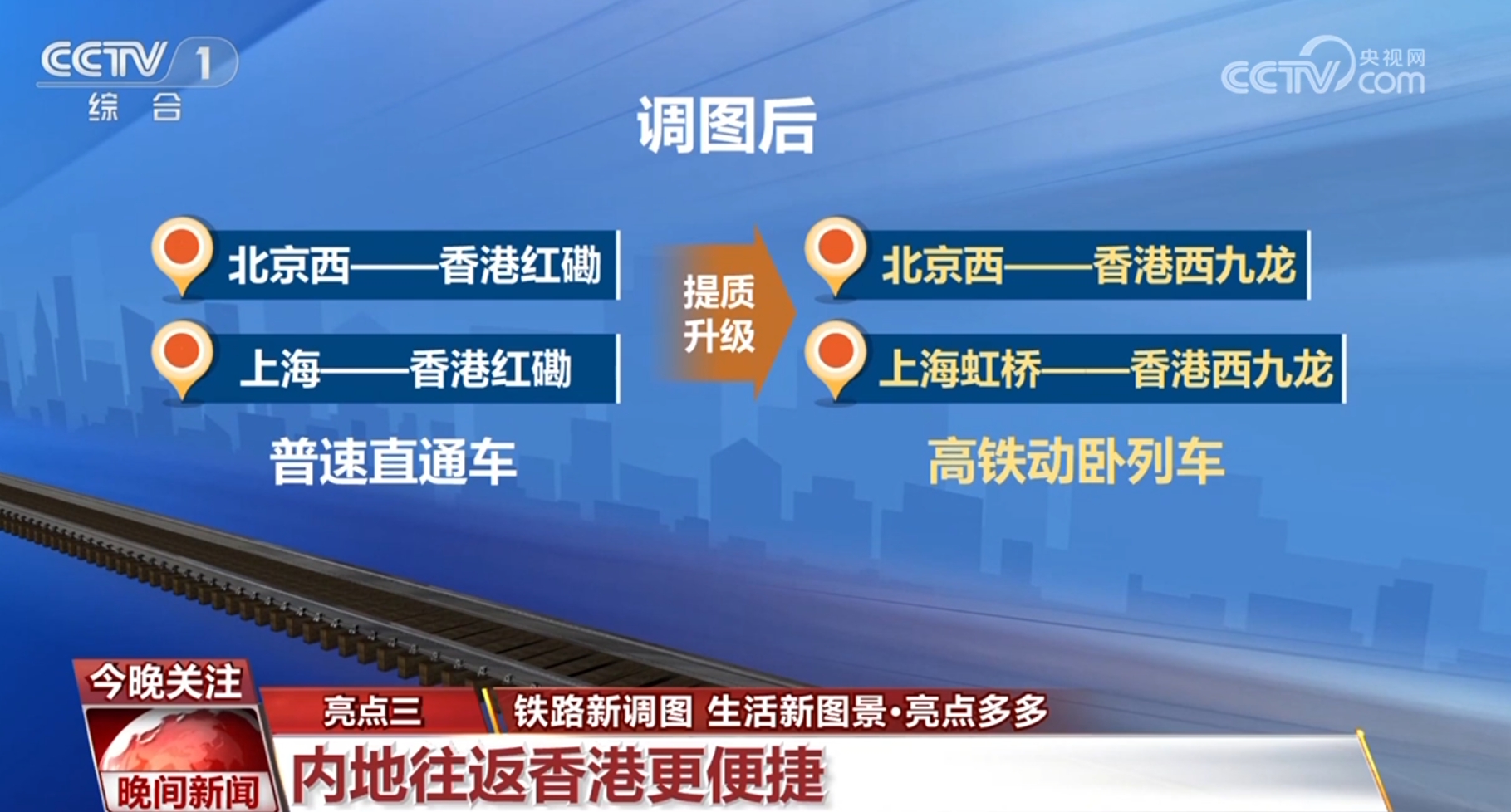 調(diào)圖后,北京西、上海與香港紅磡站間開行的普速直通車,提質(zhì)升級為北京西、上海虹橋與香港西九龍站間的高鐵動臥列車。北京至香港的全程旅行時間由原來的24小時31分壓縮至12小時34分,上海到香港從19小時34分壓縮至11小時14分。京港、滬港間實現(xiàn)夕發(fā)朝至,動臥的出行方式更可省去一晚酒店費用。
