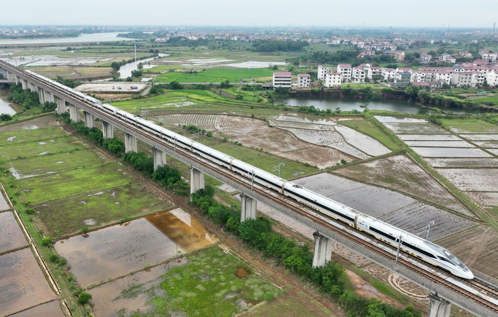 一輛高鐵列車從位于江西省鷹潭市的田野間駛過(無人機(jī)照片,6月4日攝)。新華社記者 萬象 攝