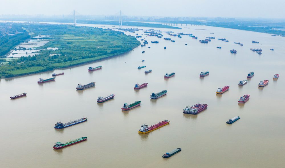 2024年6月1日,船舶在湖北武漢市陽邏港區(qū)水域行駛(無人機(jī)照片)。新華社記者 杜子璇 攝