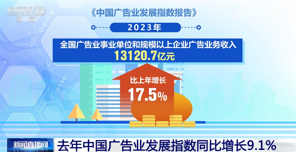 《中國(guó)廣告業(yè)發(fā)展指數(shù)報(bào)告》顯示,我國(guó)廣告業(yè)規(guī)??焖偬嵘a(chǎn)業(yè)活力不斷釋放。2023年,全國(guó)廣告業(yè)事業(yè)單位和規(guī)模以上企業(yè)廣告業(yè)務(wù)收入13120.7億元,比上年增長(zhǎng)17.5%,廣告市場(chǎng)規(guī)模占全球比重進(jìn)一步提高,繼續(xù)穩(wěn)居世界第二。
