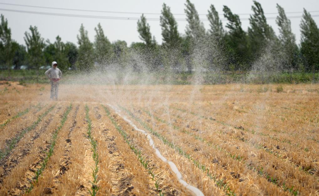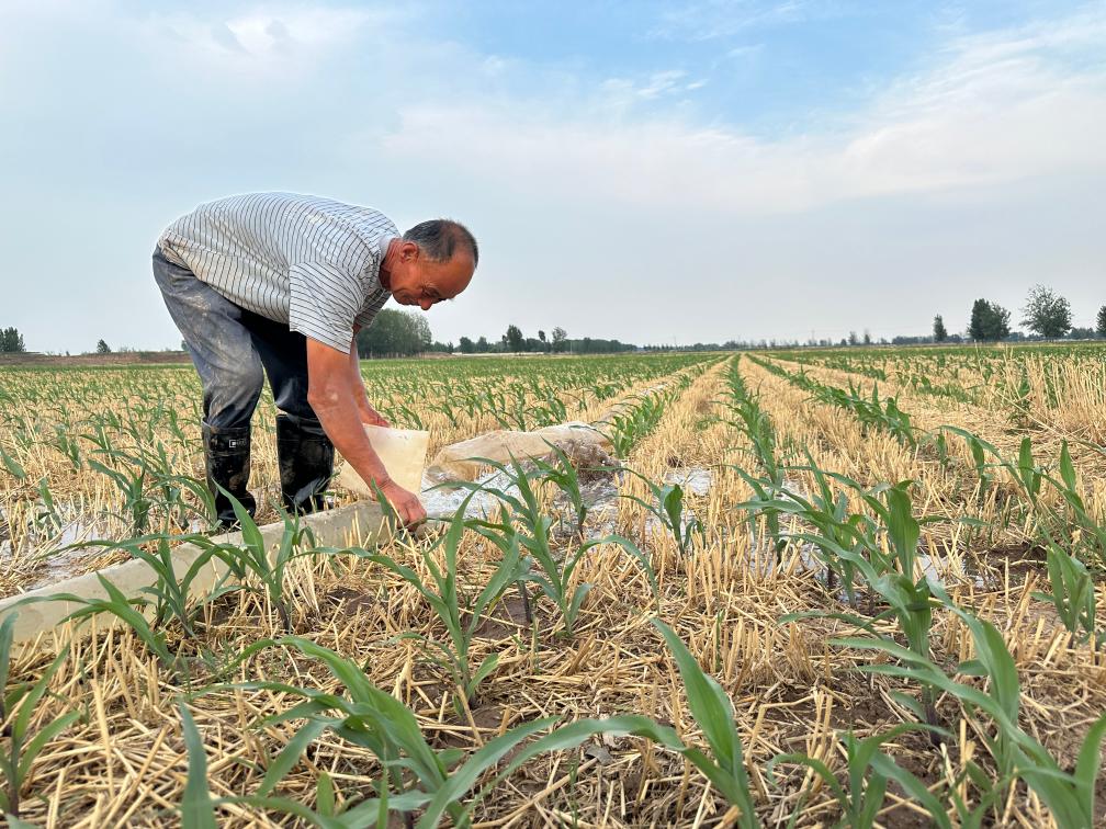 6月18日,在山東省菏澤市巨野縣麒麟鎮(zhèn)一處農田,農民江福華在灌溉玉米。新華社記者 王陽 攝