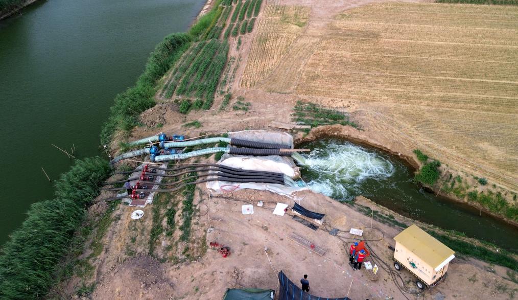 6月18日,在山東省巨野縣麒麟鎮(zhèn)的一處抗旱應急取水點,水泵正在抽水輸入農田灌溉渠道(無人機照片)。新華社記者 徐速繪 攝